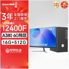 长城凌云DHC88台式电脑(i5 12400F/A380 6G独显 16G+512G 24.5英寸200Hz电竞屏)
